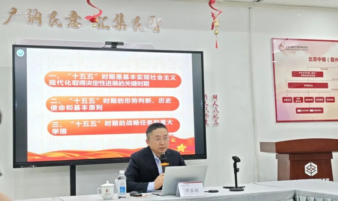 为深入学习贯彻党的二十届四中全会精神,进一步提升全所律师的政治站位与视野,凝聚奋进合力,2025 年 11 月 6 日晚,我所党支部特别邀请到江西理工大学马克思主义学院院长邓显超教授,为全体律师同仁讲授题为《确保基本实现社会主义现代化取得决定性进展———党的二十届四中全会精神解读》的专题党课,授课由市律师行业党委委员、律所党支部书记雷鹏律师主持。